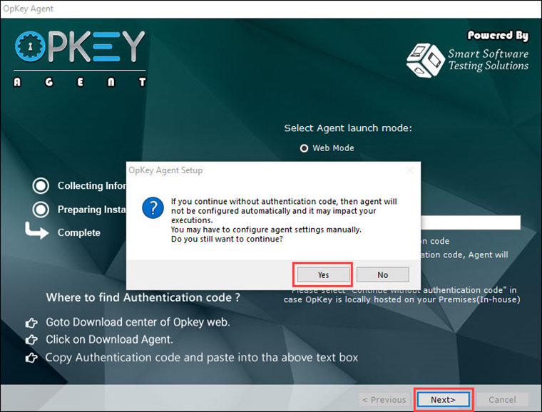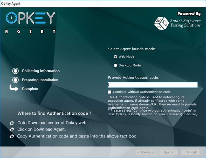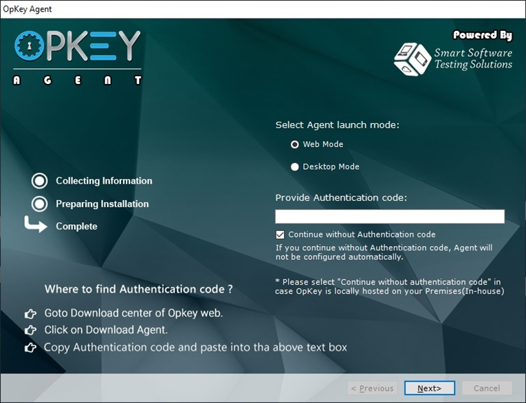 Mode (by default), you will need to enter this Agent Authentication code to