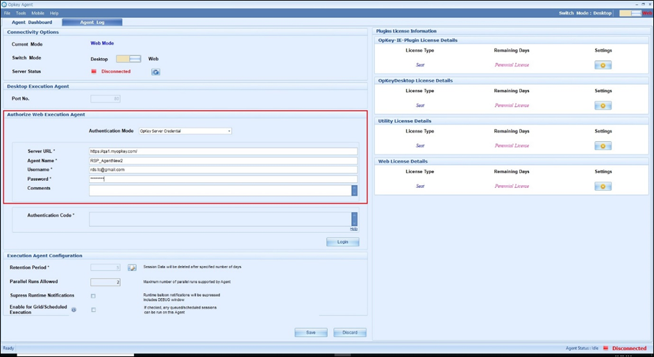 · Here, now you need to select Authentication mode as OpKey Server Credential, enter Server URL, Agent Name, Username and Password to configure OpKey Agent and then click on Login.
